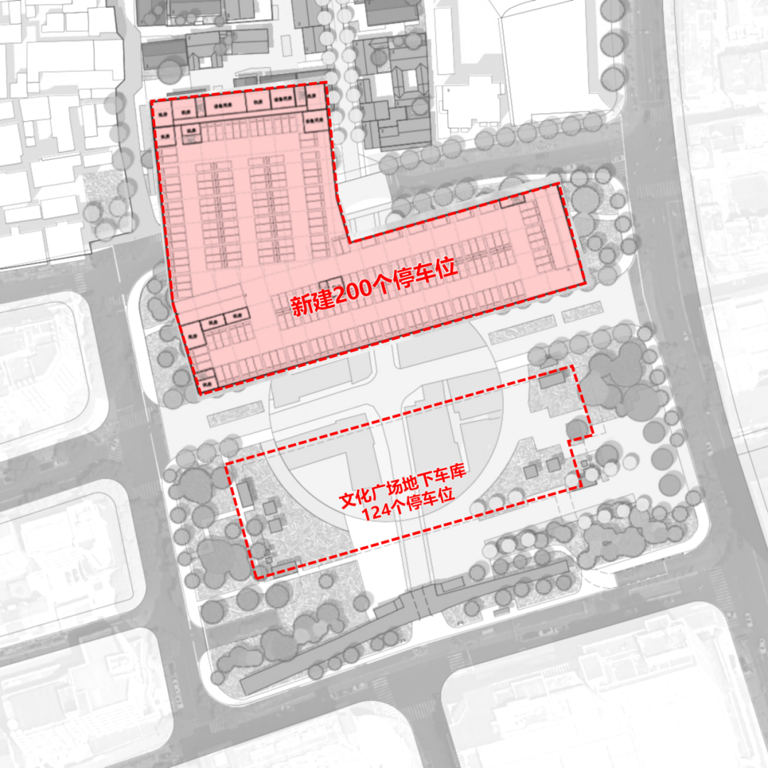 地下部分:目前文化廣場南面現(xiàn)有地下停車場124個停車位,項目計劃在北面新建地下停車場,建成后可增加約200個停車位。
