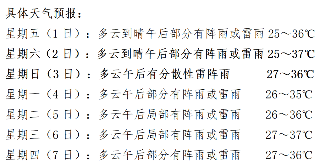 根據(jù)最新資料分析,預(yù)計本周我市以多云或晴天氣為主,午后多分散性陣雨或雷雨,周最高氣溫可達35~37℃,請做好防暑降溫工作,同時防范局地強對流帶來的不利影響。