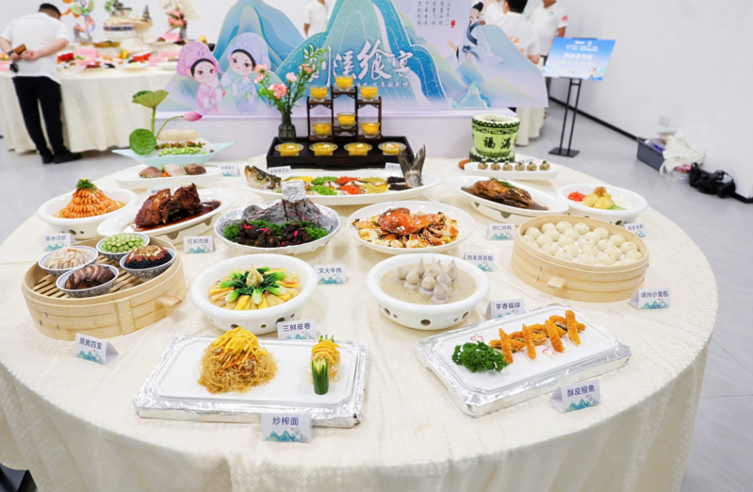 團(tuán)體賽則要求團(tuán)隊(duì)烹飪一桌家宴,菜品須涵蓋熱菜12道、冷菜4道、點(diǎn)心2道,選手們精心設(shè)計(jì)菜單,從食材的選擇到烹飪的技法,都力求展現(xiàn)出本地美食的獨(dú)特魅力??聵騾^(qū)選手汪敏健用當(dāng)?shù)匾吧■a魚(yú)做了魚(yú)凍,還有素雞卷、肉卷等等“老底子”菜品,充分展現(xiàn)地方特色。