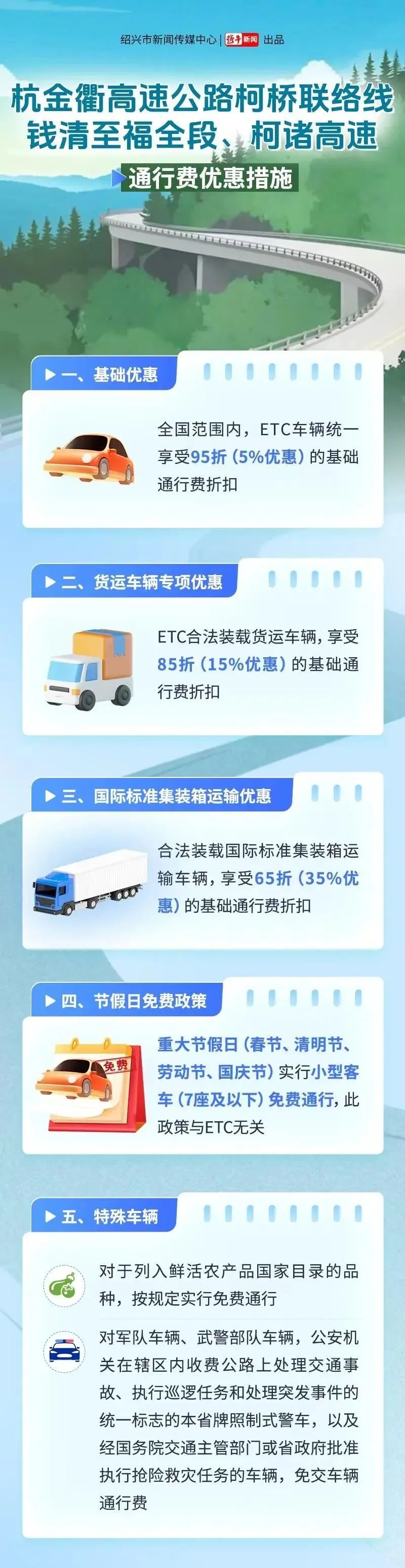 兩條高速均實(shí)行多項(xiàng)通行費(fèi)優(yōu)惠措施。據(jù)了解,兩條高速對(duì)安裝并使用ETC卡的車輛實(shí)行通行費(fèi)9.5折優(yōu)惠;重大節(jié)假日(春節(jié)、清明節(jié)、勞動(dòng)節(jié)、國(guó)慶節(jié))實(shí)行小型客車(7座及以下)按國(guó)家規(guī)定免費(fèi)通行;對(duì)于列入鮮活農(nóng)產(chǎn)品國(guó)家目錄的品種,按規(guī)定實(shí)行免費(fèi)通行等。