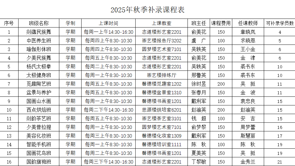 為滿足廣大老年朋友的學習需求,讓老年開放大學的課程資源惠及更多老年朋友,通過前期集中報名繳費,結(jié)合實際開班可容納人數(shù),尚有部分班級仍有名額可補錄,現(xiàn)將剩余學位推出。