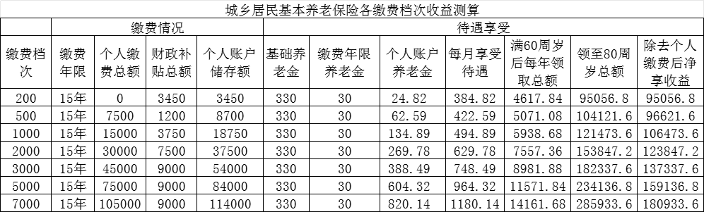 舉例:如果選擇檔次500元/年的,交滿15年,到齡后每個月領(lǐng)取420多元;而選擇最高檔次7000元/年的,交滿15年,到齡后每個月可領(lǐng)取1180多元。
