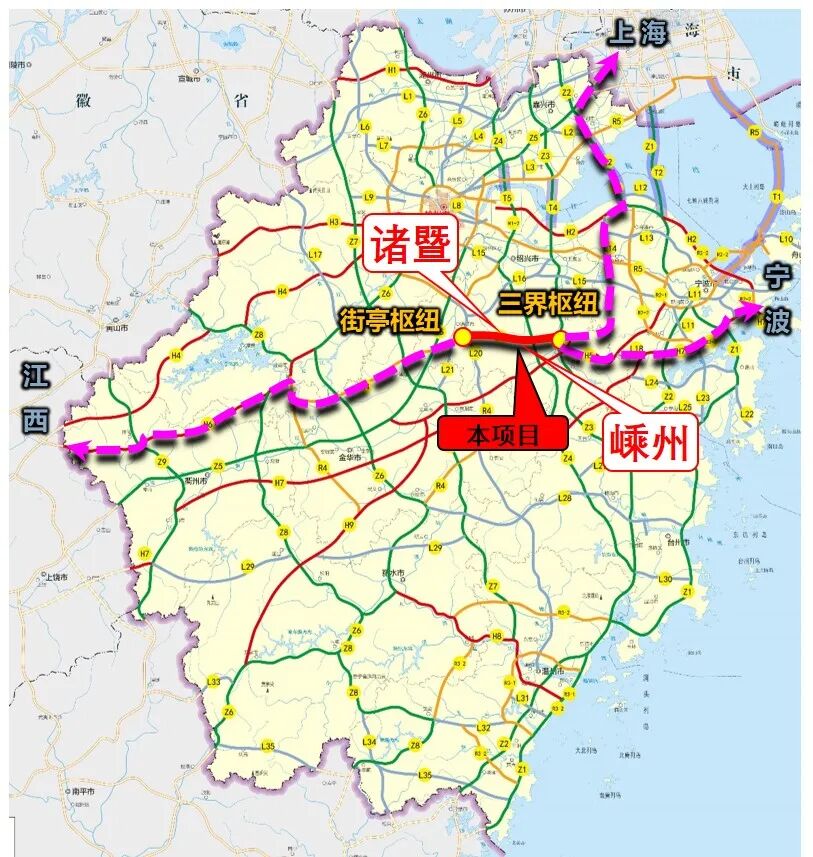 該項目起點位于諸永高速諸暨街亭樞紐順接紹諸高速延伸線,終點位于常臺高速嵊州三界鎮(zhèn)上潛岙村附近。