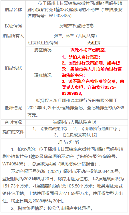一、拍賣標的:位于嵊州市甘霖鎮(zhèn)施家岙村問越路1號嵊州越劇小鎮(zhèn)紫竹苑1幢03及儲藏間的不動產(chǎn)(“來拍法服”咨詢編號:WT408485)??倢訑?shù)為4層。