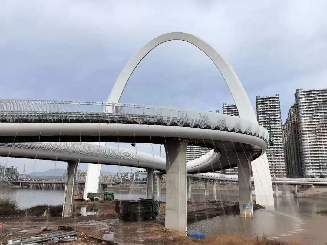 作為項(xiàng)目的標(biāo)志性景觀,步行橋施工也已接近尾聲。這座橫跨新昌江的橋梁,景觀拱跨高均達(dá)75米,主體造型宛如一雙躍動(dòng)的“翅膀”,將西岸麗湖未來(lái)城與東岸城市綜合服務(wù)核心區(qū)緊密相連。眼下,工人們正爭(zhēng)分奪秒、精細(xì)調(diào)試投光燈角度與水簾噴頭的出水方位,預(yù)計(jì)本月25日完成單體調(diào)試,隨即轉(zhuǎn)入燈光與噴泉的聯(lián)動(dòng)聯(lián)調(diào)階段。
