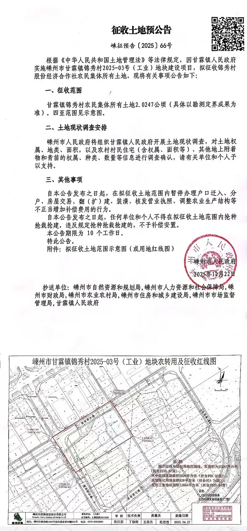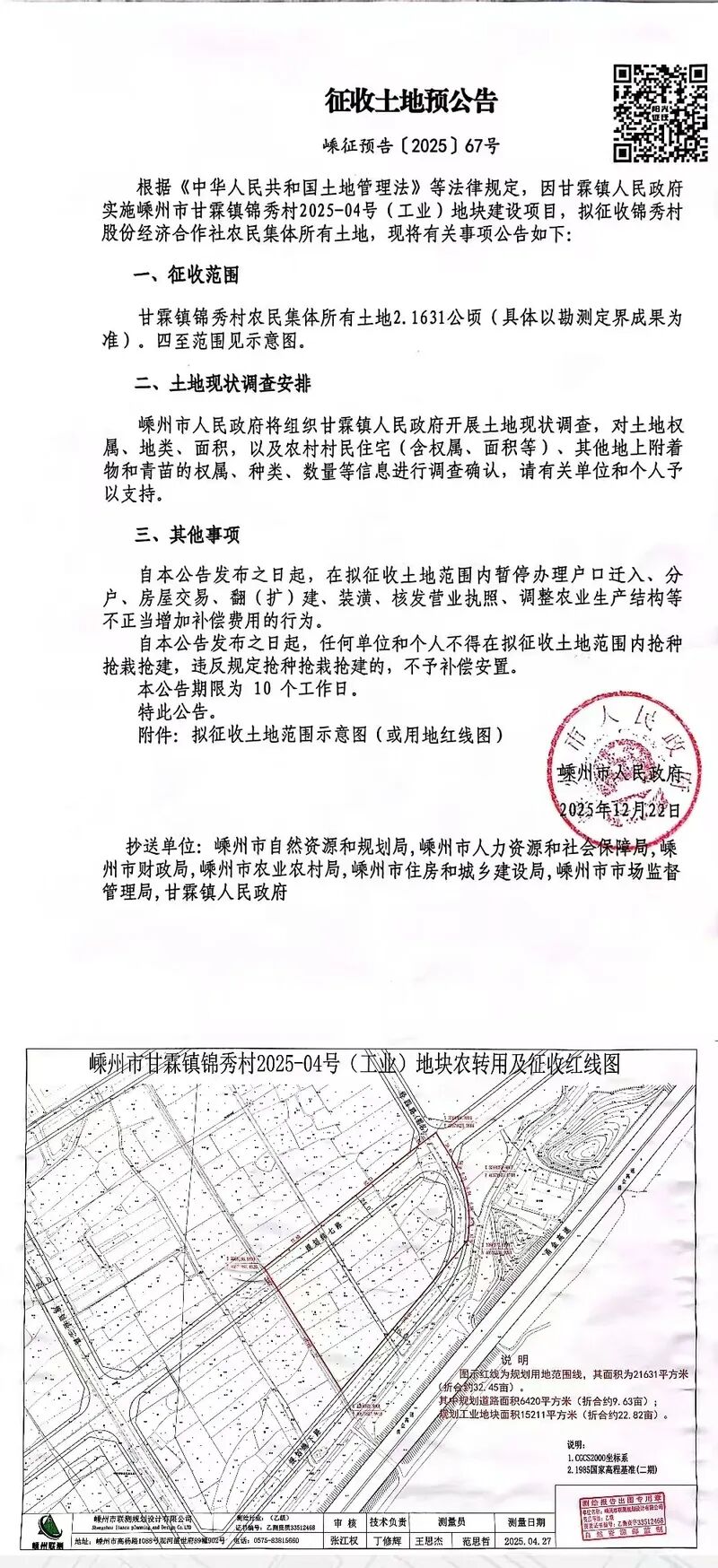 根據(jù)《中華人民共和國土地管理法》等法律規(guī)定,因甘霖鎮(zhèn)人民政府 實(shí)施嵊州市甘霖鎮(zhèn)錦秀村2025-03號(hào)(工業(yè))地塊建設(shè)項(xiàng)目,擬征收錦秀村 股份經(jīng)濟(jì)合作社農(nóng)民集體所有土地,現(xiàn)將有關(guān)事項(xiàng)公告如下:
