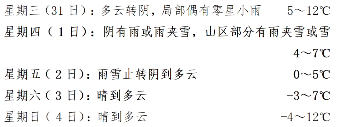 元旦前及期間(12月31日到1月3日)受強(qiáng)冷空氣影響有一次降溫、降水和風(fēng)力增大過程,過程降溫幅度7~9℃,陣風(fēng)5~7級,山區(qū)8級以上,平原地區(qū)有雨或雨夾雪,山區(qū)部分有雨夾雪或雪并可能出現(xiàn)積雪。