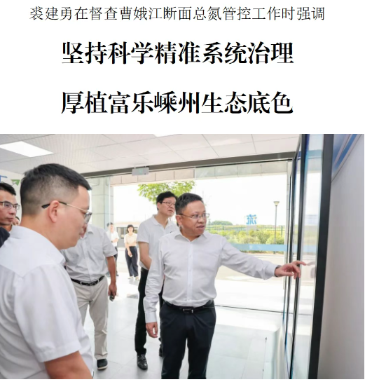 8月20日下午,市委書記裘建勇就曹娥江斷面總氮管控工作進行專項督查。他強調(diào),要深入學(xué)習(xí)貫徹習(xí)近平生態(tài)文明思想和習(xí)近平總書記考察浙江重要講話精神,根據(jù)上級部署要求,堅持科學(xué)精準系統(tǒng)治理,深入打好污染防治